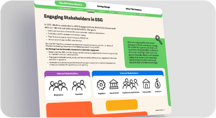 HowESGDrivesWorkiva DrivingChange AboutThisSummary KEYESGDEVELOPMENTS GOVERNANCE STAKEHOLDERS MATERIALITY STRATEGY RESPONSIBLEGOVERNANCEPRACTICES VALUECHAIN EngagingStakeholdersinESG In 2021, WorkivaconductedanESGEngagementandMaterialityAssessment withourinternalandexternalstakeholders.Ourgoals: • Identify,define,andprioritizetheESGissuesthatmattermosttoourstakeholders • FortifyWorkiva’sESGstrategiesanddecision-making • PinpointareasofopportunitytoincreaseourESGefforts • UncoverareasofpotentialESGrisktoWorkiva Workiva’songoingESGstakeholder dialoguewilldrivecontinuouschange. Workiva’sESGTaskForcereviewedthestakeholderassessmentreportinJuly2021.OurBoardof Wedothisthroughthesolicitationof DirectorsNominating&GovernanceCommitteeapproveditinAugust2021. inputfromallstakeholdersintheform KeyfindingsfromtheMaterialityAssessment’sstakeholderengagement: ofsurveys,meetings,interviews,and • StakeholdersfeelESGprioritiesmustguideWorkiva’stopmanagementdecisionseverydayandplay specialrequests.Workivawillconduct animportantroleinourcompany’sstory adeep-divereviewofitsmateriality • Employeesinsistthatdiversity,equity,andinclusion(DE&I)effortsarenon-negotiableinWorkiva’s assessmenteverythreeyears,and award-winningculture adjustitsESGprioritiesaccordingly. • CustomersandpartnersexpectWorkivatofollowrigorousgovernancebestpracticesgiventhe company’sbusinessofferingoftransparentreporting InternalStakeholders ExternalStakeholders Employees Founders Suppliers Government CustomersandPartners Communities Investors DRIVINGCHANGE | 5