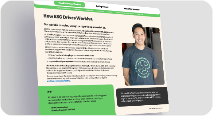 HowESGDrivesWorkiva DrivingChange AboutThisSummary KEYESGDEVELOPMENTS GOVERNANCE STAKEHOLDERS MATERIALITY STRATEGY RESPONSIBLEGOVERNANCEPRACTICES VALUECHAIN HowESGDrivesWorkiva Ourworldiscomplex.Doingtherightthingshouldn’tbe. Societyexpectsmorefromthebusinesscommunity:authenticity,trust,truth,transparency. TheseexpectationslieattheheartofwhatWorkivadoesforcustomersandourselves. AtWorkiva,wepowerourcustomers’transparentfinancialandenvironmental,socialand governance(ESG)reportingtohelpcreateabetterworld.Workivadeliversacloud-native platformthattransformsthewaypeoplemanageandreportbusinessdatawithvarious collaborators,datasources,documents,presentations,andspreadsheets.TheWorkiva platformmodernizeshowpeopleworkatthousandsoforganizationsacrosstheglobe. Whenitcomestoourcompany’sESGresponsibilities,Workivatracksacoursefor consistentprogressandexcellence.ThisexecutivesummaryoutlinesourESGstrategy andensuresthatwe: • advancetrustandbelonginginourworkforceandindustry • standfortruthinourcustomerandpartnerinteractionsandinmarketingpractices • stayconsistentlytransparentaboutourimpactwithsocietyandouremployees ThisexecutivesummaryhighlightsWorkiva’smeaningfuleffortsduring2020–2021,including thecreationofourguidingESGstrategy,ESGgovernancestructure,materialityapproach, stakeholderengagementprocess,andalignmentwithUnitedNationsSustainable DevelopmentGoals(UNSDGs). TolearnmoreaboutWorkiva’sESGefforts,trackourprogressindevelopingforward-looking commitmentsandkeyperformanceindicatorsafterreadingthisreport,goto workiva.com/sustainability. Workivaisonthecuttingedgeofensuringdataisdrivinggood WeusedtheWorkivaplatformtostreamlineour decisionsforcompanies,astheyworktowardscreatinga entirereportingprocess:automatedatacollection, strongercompany—andultimatelyabetterworld. aligntoframeworks,andconnectourESGreports, datacenter,andwebpages. —MartyVanderploeg, WorkivaPresidentandCEO HOWESGDRIVESWORKIVA | 2