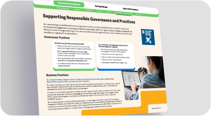 HowESGDrivesWorkiva DrivingChange AboutThisSummary KEYESGDEVELOPMENTS GOVERNANCE STAKEHOLDERS MATERIALITY STRATEGY RESPONSIBLEGOVERNANCEPRACTICES VALUECHAIN SupportingResponsibleGovernanceandPractices Anunwaveringcommitmenttosoundgovernanceforsociety’sbenefithelpsdriveWorkiva’sCore Principlesthroughoutourcompany.Andweconstantlyrefineourgovernancestrategy.OurBoardof Directorsandmanagementregularlyreviewbestcorporate,governance,andbusinesspracticesand modifyourapproachasnecessary. GovernancePractices Workiva’scurrentbestpracticesinclude: Ourcontinuoustrainingprogramensuresthat • ABoardofDirectorsledbyanindependentchair 100%ofemployeescomplete: andcomprisingprimarilyofindependentdirectors • Informationsecurityandsecuritiestrading • FullyindependentBoard,AuditCommittee, trainingwithin48hoursofstartingwork CompensationCommittee,andNominating& • Codeofconducttrainingeachyear GovernanceCommittee • Anti-corruptionandbriberytrainingannually • Disclosureofexecutivecompensationpolicyand • Datasecuritytrainingeachyear theCEO-to-employeecompensationratio • Workplaceharassmenttrainingannually • Ananti-corruption/exportcontrols/economic sanctionspolicy BusinessPractices OurCodeofConduct,SupplierCodeofConduct,andAnti-CorruptionPolicyeachsupportsbest sustainability practices andisavailableonlineforinspection. OurboardhasmadecybersecurityanddataprivacythreatsatoppriorityatWorkiva.Reportsonourefforts againstthesethreatsaredeliveredateveryboardandauditcommitteemeeting,andacomprehensive cybersecurityreportisconsideredannuallybytheboard. TheboardissupportedbyaglobalCyberSecurityworkinggroupthatincludesexpertsfromprivacy,legal, compliance,andotherfunctionswhostrategizehowweshoulddealwithcybercrime.Thetaskforce’s efforts helped Workiva get authorization as a Moderate Impact Cloud Service Provider under the FedRAMPprogram. Workivaalsousesthird-partyauditorstoevaluateourcontrolsagainsttheSOC1andSOC2compliance frameworks.Weregularlyconductsupplierriskreviewstomakesureconfidential,sensitive,andproprietary dataareaccessedandhandledproperly.AndinAugust2021,WorkivaachievedISO27001certificationfora comprehensiveandeffectiveinformationsecuritymanagementsystemandbestpractices. DRIVINGCHANGE | 8
