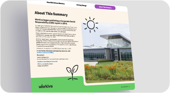 HowESGDrivesWorkiva DrivingChange AboutThisSummary AboutThisSummary WorkivabeganpublishingaCorporateSocial Responsibility(CSR)reportin2014. In creating the â2020-2021WorkivaEnvironmental,SocialandGovernance GlobalImpactSummary,âweusedourWorkivaplatformtostreamlineour entireESGprocess:automatedatacollection,aligntoframeworks,and connectourESGreports,datacenter,andwebpages. Pleasenotethatthisreportincludesdataandactivitiesfromourglobal operationsforcalendaryear2020.Unlessotherwisenoted,alldatais accurateasofDecember31,2020. All of our reporting will be prepared in accordance with the Global ReportingInitiative(GRI)andtheSustainableAccountingStandardsBoard (SASB)standards;andinalignmentwithUnitedNationsSustainable DevelopmentGoals(UNSDGs)andtheTaskForceonClimate-Related FinancialDisclosures(TCFD). IndexeswillbeavailableinourESGDataCenterlaterin2021. Forfullfurtherinformationandreportingresources,visit: workiva.com/sustainability. Or,contact: MandiMcReynolds SeniorDirector,Environment,Social,andGovernance [email protected] 2900UniversityBoulevard Ames,Iowa50010 ABOUTTHISREPORT | 20