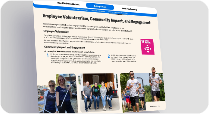 HowESGDrivesWorkiva DrivingChange AboutThisSummary DIVERSITYANDCOLLABORATION CUSTOMERSANDPARTNERS COMMUNITYANDENVIRONMENTALIMPACT EmployeeVolunteerism,CommunityImpact,andEngagement Workivarecognizesthatactiveengagementbyourcompanyandindividualemployeesinour communities,andresponsibleinnovationwithourproductsandpoliciesarevitaltoourplanet’shealth. EmployeeVoluntarism EveryWorkivaemployeereceiveseighthoursofpaidvolunteertimeoff(VTO)eachyear,touseatanytimetosupportacommunitycause. In 2020, our employeeslogged1,714VTOhours.Workiva’sgoalistoexceedthatnumberin2021. WehaveinvestedinBenevitysocialpurposesoftware.Itenablesemployeestodonatetocharitiesofchoiceandtoidentifylocaland virtual volunteering opportunities. CommunityImpactandEngagement JustacoupleofWorkiva’s2020-2021donationsworthnotingincluded: DuringourannualWeekofGivinginOctober2020,wesetacompanywide In 2021, Workivadonated$25,000eachto 1 donationgoalof$50,000,withadollar-for-dollarmatchbycorporate.We 2 theNAACP,EqualJusticeInitiative,and soaredpastthatgoalwithnearly$82,000ofdonationsthatcorporate UNICEF(tohelpCOVIDeffortsinIndia, matched.Andourseniorexecutivesgraciouslyacceptedpiessmashedin whereweemploynearly150contractors). their faces (on cameraforalltosee)toraiseanadditional$12,000. DRIVINGCHANGE | 18