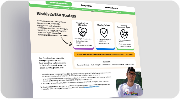 HowESGDrivesWorkiva DrivingChange AboutThisSummary KEYESGDEVELOPMENTS GOVERNANCE STAKEHOLDERS MATERIALITY STRATEGY RESPONSIBLEGOVERNANCEPRACTICES VALUECHAIN Workiva’sESGStrategy Workiva’soverallESGstrategybinds AdvancingTrust StandingforTruth Powering ourgovernance,stakeholder &Belonging TransparentImpact engagement,andmateriality assessmenttogether.Thatstrategyis foundeduponthreeCorePrinciples, supportedbyanunwavering commitmenttoourcorporatevalues. • Diversity,Equity&Belonging • CustomerEngagement • Community Engagement • EmployeeExperience &Satisfaction &Impact &Culture • InnovativeProducts • EmployeeVolunteerism • EmployeeHealth&Wellbeing • SustainableOperations Governance&RiskManagement • ResponsibleBusinessPractices • Privacy&DataSecurity OurCorePrinciplesupholdthe strongestgovernanceand businessethicsandareessential ————OURVALUES ———— toWorkiva’scorporatevaluesand CustomerSuccess • Trust • Integrity • Collaboration • Innovation • Inclusion • Accountability roleasatrustedpartner.Why? • OurcustomersandbusinesspartnersputtheirtrustinWorkivaeveryday.Maintainingthattrustdemandsmorethanthe correctpoliciesandpractices.Itrequiresamindsetofaccountabilityateverylevelofourcompany. • AsWorkivagrows,weencounternewregulationsandbusinessstandardsinourkeymarketsandthoseofourcustomers. Wemustgreetthoseregulationsandstandardswithcomplianceandtransparency. • Particularlyinthetechindustry,Workivamustmeetthehigheststandardsfordatasecurityandprivacyatalltimes. Toshowrealactionbehindthosegoals,wepublishourESGpolicies,frameworkandstandardforreportingindexes,and initiatives for public view. They can be found in our ESG Data Center at workiva.com/sustainability. DRIVINGCHANGE | 7
