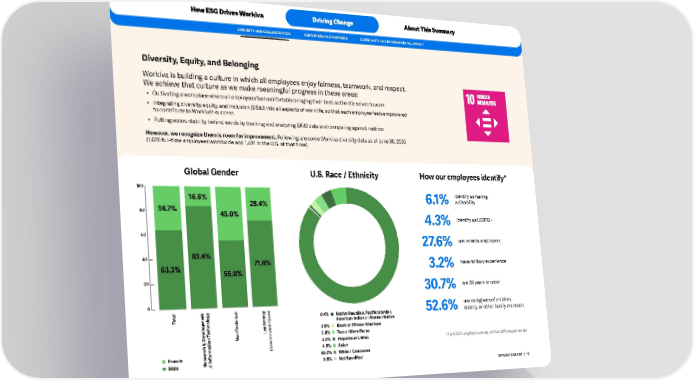HowESGDrivesWorkiva DrivingChange AboutThisSummary DIVERSITYANDCOLLABORATION CUSTOMERSANDPARTNERS COMMUNITYANDENVIRONMENTALIMPACT Diversity,Equity,andBelonging Workivaisbuildingacultureinwhichallemployeesenjoyfairness,teamwork,andrespect. Weachievethatcultureaswemakemeaningfulprogressintheseareas: • Cultivatingaworkplacewhereallemployeesfeelcomfortablebringingtheirbest,authenticselvestowork • Integratingdiversity,equity,andinclusion(DE&I)intoallaspectsofworklife,sothateachemployeefeelsempowered tocontributetoWorkiva’ssuccess • PuttingaccountabilitybehindwordsbytrackingandanalyzingDE&Idataandcomparingagainstmetrics However,werecognizethereisroomforimprovement.FollowingaresomeWorkivadiversitydataasofJune30,2020 (1,626 full-time employeesworldwideand1,401intheU.S.atthattime). GlobalGender U.S.Race/Ethnicity Howouremployeesidentify* 100 16.6% identify as having 28.4% 6.1% adisability 80 36.7% 45.0% 4.3% identifyasLGBTQ+ 60 27.6% areremoteemployees 40 83.4% 63.3% 71.6% 3.2% havemilitaryexperience 55.0% 20 30.7% are39yearsorolder 0 arecaregiversofchildren, al y al e t g v 0.4% NativeHawaiian,PacificIslander, 52.6% elderly,orotherfamilymembers o ship T Abo AmericanIndianorAlaskanNative echnic der elopment T a 2.0% BlackorAfricanAmerican v echnolo e and T L or 2.8% TwoorMoreRaces De Non- & tion ect 3.4% HispanicorLatino *April 2020employeesurvey,withan81%responserate ch Dir 4.9% Asian arorma Female seInf 85.9% White/Caucasian e Male R & 0.5% NotSpecified DRIVINGCHANGE | 12