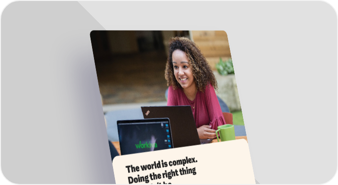The world is complex. Doing the right thing shouldn’t be. At Workiva, we simplify reporting for a beer world. Society expects more from the business community—authenticity, trust, truth, and transparency. Those values lie at the heart of what we do. Boom line—it’s about seing a course of progress not perfection. By embracing our purpose and our values, we’re geing beer every day and helping our employees and customers change the world for the beer. It’s just that simple. Our environmental, social, and governance strategy helps ensure we operate responsibly, empower our employees to act with purpose, and enable our customers to accurately track their own progress and impact—all with open and honest communication. For information about our full ESG efforts, visit workiva.com/sustainability. For our ESG reporting, we used Workiva platform to streamline our entire ESG process: Automate data collection, align to frameworks, and connect our ESG reports, data center, and webpages.