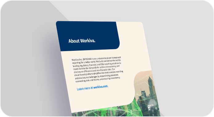 About Workiva. Workiva Inc. (NYSE:WK) is on a mission to power transparent reporting for a beer world. We build and deliver the world’s leading regulatory, financial, and ESG reporting solutions to meet stakeholder demands for action, transparency, and disclosure of financial and non-financial data. Our cloud-based platform simplifies the most complex reporting and disclosure challenges by streamlining processes, connecting data and teams, and ensuring consistency. Learn more at workiva.com. WWORKIVORKIVA ESG REPA ESG REPORORT FINDINGT FINDING 21