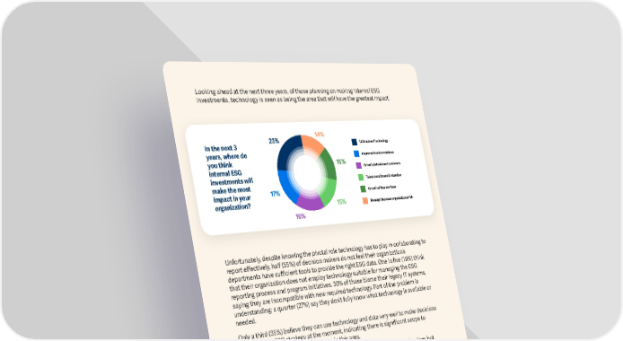 Looking ahead at the next three years, of those planning on making internal ESG investments, technology is seen as being the area that will have the greatest impact. 23% 14% In the next 3 Utilization of technology years, where do Improved investor relations you think 15% internal ESG Growth/retention of customers investments will Talent recruitment & retention make the most 17% impact in your Growth of investor base organization? 15% Manage/decrease organizational risk 16% Unfortunately, despite knowing the pivotal role technology has to play in collaborating to report effectively, half (55%) of decision makers do not feel their organization’s departments have sufficient tools to provide the right ESG data. One in five (19%) think that their organization does not employ technology suitable for managing the ESG reporting process and program initiatives. 30% of those blame their legacy IT systems, saying they are incompatible with new required technology. Part of the problem is understanding: a quarter (27%) say they don’t fully know what technology is available or needed. Only a third (35%) believe they can use technology and data very well to make decisions on advancing ESG strategy at the moment, indicating there is significant scope to improve efficiencies and performance in this area. It is clear from our research that businesses understand the value of technology but aren’t yet using it to its full potential. Failure to invest will eventually lead to businesses falling behind and diminish their ability to demonstrate a high level of ESG performance to stakeholders. WORKIVA ESG REPORT FINDING 11