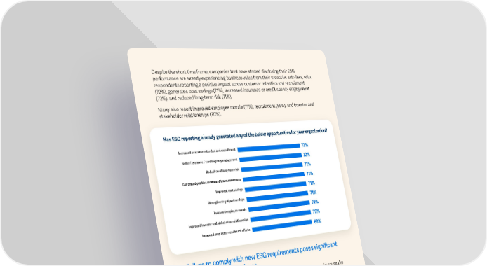 Despite the short time frame, companies that have started disclosing their ESG performance are already experiencing business value from their proactive activities, with respondents reporting a positive impact across customer retention and recruitment (72%), generated cost savings (71%), increased insurance or credit agency engagement (72%), and reduced long-term risk (71%). Many also report improved employee morale (71%), recruitment (69%), and investor and stakeholder relationships (70%). Has ESG reporting already generated any of the below opportunities for your organization? Increased customer retention and recruitment 72% Beer insurance / credit agency engagement 72% Reduction of long-term risk 71% Generated positive media and brand awareness 71% Improved cost savings 71% Strengthening of partnerships 71% Improved employee morale 71% Improved investor and stakeholder relationships 70% Improved employee recruitment efforts 69% Failure to comply with new ESG requirements poses significant risks to the entire business. Decision makers believe that the financial impact of regulatory action would cause the greatest harm to their business (59%), but that is closely followed by concerns that investors would walk away (57%), sales would be lost (48%) and reputation dented (48%). Within the next 3 years, what do you believe would have the biggest impact if your organization fails to comply with ESG regulations? 59% 57% 48% 48% 45% 43% Financial impact Financial impact Loss of revenue Reputational Lack of consumer Challenges through negative through lack or sales damage confidence with recruitment regulatory action of investment WORKIVA ESG REPORT FINDING 45